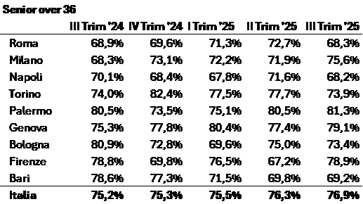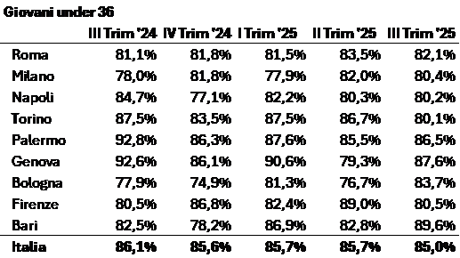 Gli scenari mutano anche da città a città: tra le prime nove città italiane, nel III trimestre 2025 i divari sono ampi. Prendiamo ad esempio la fascia demografica over 36: si va da un Loan-to-Value medio del 68,2% a Napoli all’81,3% di Palermo. Per i giovani, invece, si passa dall’80,1% di Torino all’89,6% di Bari.